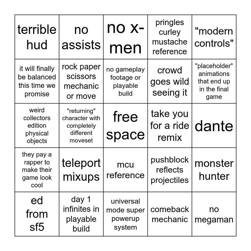 This bingo card has a free space and 24 words: ed from sf5, teleport mixups, no gameplay footage or playable build, comeback mechanic, "modern controls", terrible hud, no assists, no x-men, take you for a ride remix, dante, weird collectors edition physical objects, rock paper scissors mechanic or move, pushblock reflects projectiles, monster hunter, it will finally be balanced this time we promise, day 1 infinites in playable build, universal mode super powerup system, pringles curley mustache reference, "placeholder" animations that end up in the final game, they pay a rapper to make their game look cool, "returning" character with completely different moveset, mcu reference, crowd goes wild seeing it and no megaman.