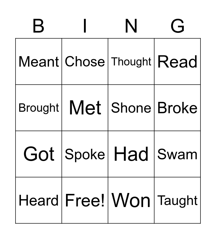 This bingo card has 24 words: Was Were, Left, Broke, Lost, Brought, Meant, Met, Chose, Free!, Flew, Got, Had, Burnt, Sent, Shone, Wore, Won, Thought, Spoke, Swam, Heard, Taught, Read and Rode.