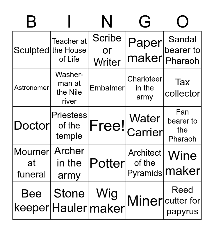 This bingo card has a free space and 24 words: Archer in the army, Stone Hauler, Embalmer, Bee keeper, Sandal bearer to Pharaoh, Sculpted, Astronomer, Teacher at the House of Life, Water Carrier, Potter, Charioteer in the army, Doctor, Architect of the Pyramids, Wine maker, Washer-man at the Nile river, Miner, Fan bearer to the Pharaoh, Scribe or Writer, Tax collector, Priestess of the temple, Reed cutter for papyrus, Mourner at funeral, Paper maker and Wig maker.
