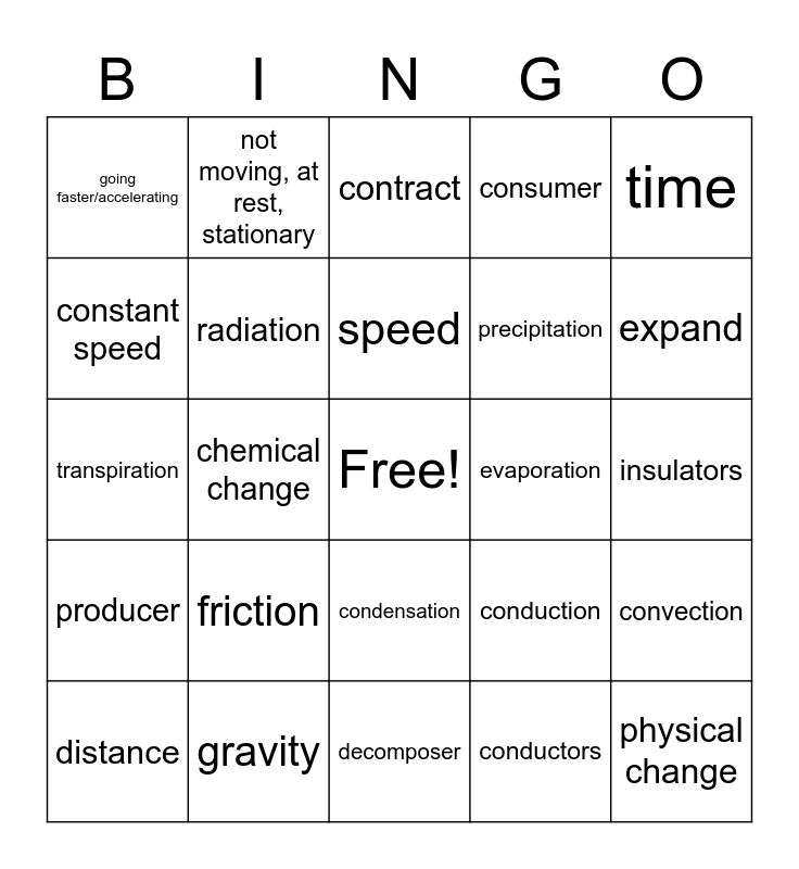 This bingo card has a free space and 24 words: friction, gravity, speed, distance, time, going faster/accelerating, constant speed, not moving, at rest, stationary, evaporation, condensation, precipitation, transpiration, conduction, convection, radiation, conductors, insulators, contract, expand, chemical change, physical change, producer, consumer and decomposer.
