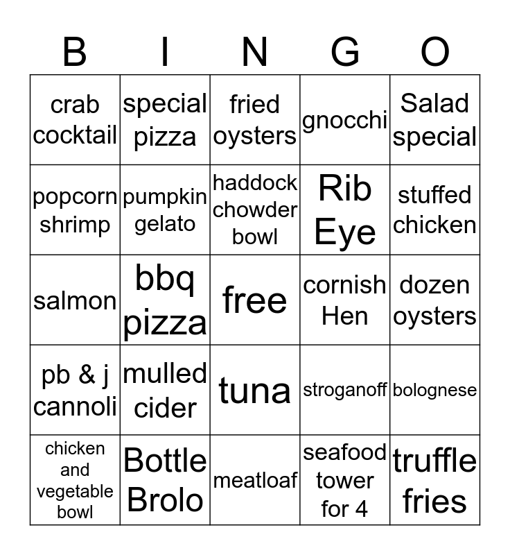 This bingo card has a free space and 24 words: mulled cider, Bottle Brolo, haddock chowder bowl, chicken and vegetable bowl, Salad special, crab cocktail, popcorn shrimp, special pizza, cornish Hen, tuna, Rib Eye, salmon, stroganoff, bolognese, pumpkin gelato, seafood tower for 4, dozen oysters, fried oysters, stuffed chicken, bbq pizza, truffle fries, pb & j cannoli, gnocchi and meatloaf.