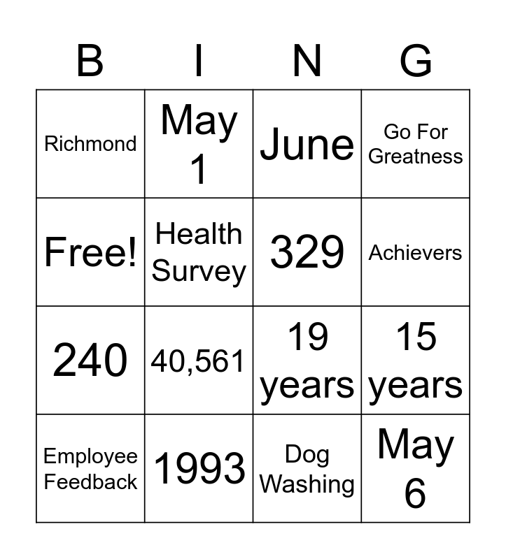 This bingo card has 16 words: 1993, 15 years, June, Richmond, 240, May 1, 19 years, Dog Washing, Free!, Health Survey, Employee Feedback, Go For Greatness, 40,561, Achievers, 329 and May 6.