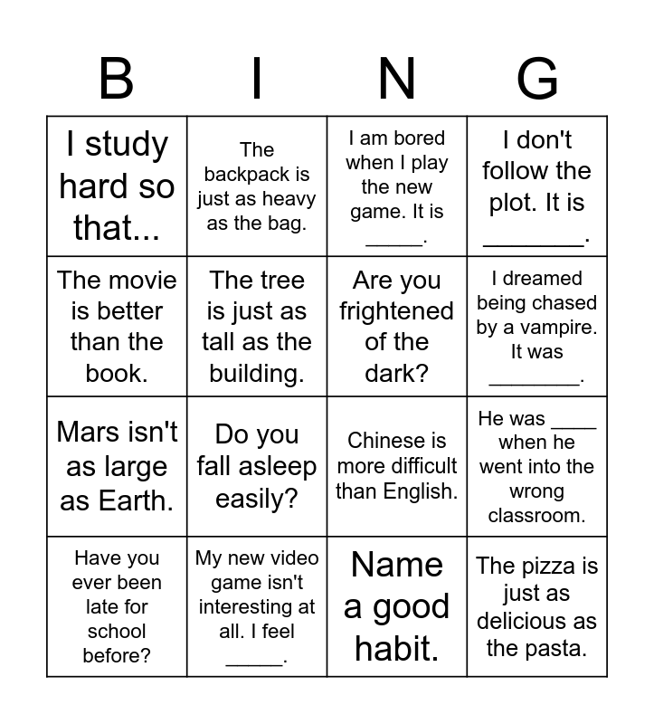 This bingo card has 16 words: My new video game isn't interesting at all. I feel _____., He was ____ when he went into the wrong classroom., I am bored when I play the new game. It is _____., I study hard so that..., Mars isn't as large as Earth., The backpack is just as heavy as the bag., Chinese is more difficult than English., Name a good habit., The movie is better than the book., The tree is just as tall as the building., Have you ever been late for school before?, I don't follow the plot. It is _______., Do you fall asleep easily?, I dreamed being chased by a vampire. It was ________., Are you frightened of the dark? and The pizza is just as delicious as the pasta..