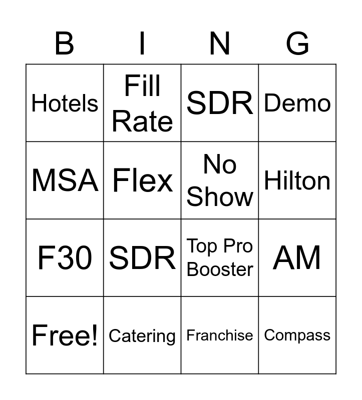 This bingo card has 23 words: Compass, Fixed, Hilton, Top Pro Booster, MSA, Hotels, Flex, Fill Rate, Free!, ACH, SDR, F30, Demo, No Show, Catering, Franchise, SDR, Top Pro Booster, No Show, AM, Demo, Franchise and Fill Rate.