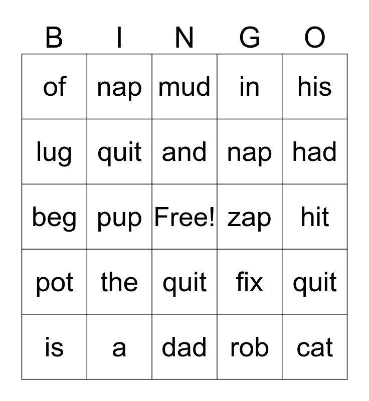 This bingo card has a free space and 24 words: the, a, and, is, his, of, lug, nap, zap, quit, nap, beg, fix, quit, quit, rob, hit, mud, had, pup, cat, pot, in and dad.
