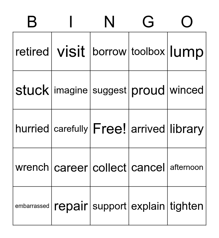 This bingo card has a free space and 24 words: career, repair, suggest, embarrassed, lump, retired, stuck, visit, arrived, collect, proud, hurried, cancel, afternoon, imagine, explain, library, borrow, winced, carefully, tighten, wrench, toolbox and support.