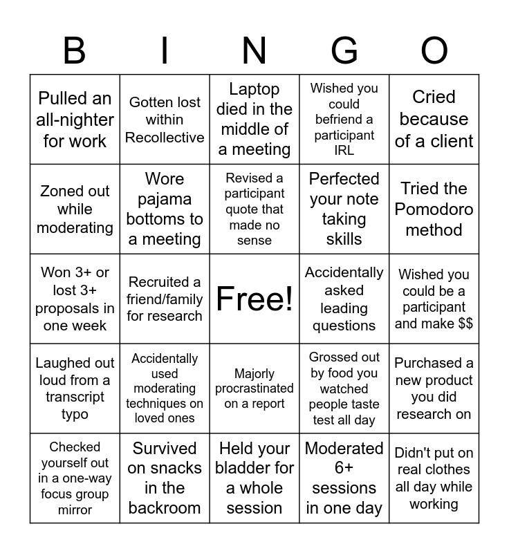 This bingo card has a free space and 39 words: Immediately noted a typo... after you sent the email, "Tell me more about that", Been confused by a quant methodology, Grossed out by food you watched people taste test all day, Purchased a new product you did research on, Laughed out loud from a transcript typo, Recruited a friend/family for research, Accidentally been late to a client meeting, Accidentally asked leading questions, Wished you could be a participant and make $$, Zoned out while moderating, Gotten lost within Recollective, Had a dream about work, Tried the Pomodoro method, Won 3+ or lost 3+ proposals in one week, Accidentally used moderating techniques on loved ones, Majorly procrastinated on a report, Wished you could befriend a participant IRL, Dealt with a scam participant, Checked yourself out in a one-way focus group mirror, Wore pajama bottoms to a meeting, Revised a participant quote that made no sense, Moderated 6+ sessions in one day, Cried because of a client, Cringed while watching footage of yourself moderating, Survived on snacks in the backroom, Held your bladder for a whole session, Wined and dined clients, Had a flight delayed while travelling for work, Pulled an all-nighter for work, Treated yourself on the client's dime, Visited a new state for work, Perfected your note taking skills, Didn't put on real clothes all day while working, Copied and pasted directly off another proposal, "Hey, does anyone know a proposal where...", Laptop died in the middle of a meeting, Been on hold with Handled for far too long and Asked quant team for Excel help.