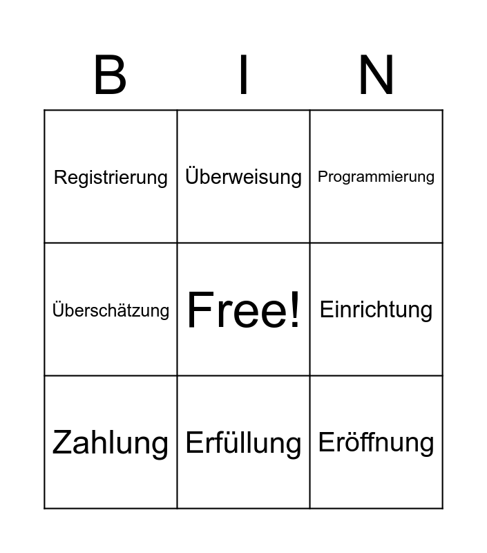 This bingo card has a free space and 14 words: Empfehlung, Nutzung, Zahlung, Überweisung, Überschätzung, Eröffnung, Verabredung, Verlängerung, Erfüllung, Registrierung, Zeichnung, Einrichtung, Programmierung and Übung.