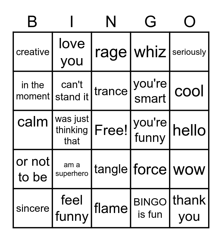 This bingo card has a free space and 24 words: sincere, am a superhero, trance, BINGO is fun, seriously, creative, love you, rage, you're funny, hello, calm, can't stand it, force, wow, in the moment, feel funny, flame, whiz, cool, or not to be, was just thinking that, tangle, you're smart and thank you.