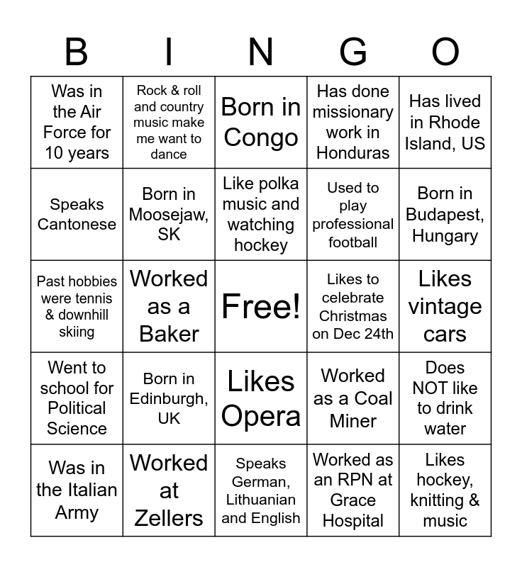 This bingo card has a free space and 24 words: Born in Edinburgh, UK, Worked at Zellers, Like polka music and watching hockey, Was in the Italian Army, Has lived in Rhode Island, US, Was in the Air Force for 10 years, Speaks Cantonese, Rock & roll and country music make me want to dance, Likes to celebrate Christmas on Dec 24th, Likes Opera, Used to play professional football, Past hobbies were tennis & downhill skiing, Worked as a Coal Miner, Does NOT like to drink water, Born in Moosejaw, SK, Worked as an RPN at Grace Hospital, Likes vintage cars, Born in Congo, Born in Budapest, Hungary, Worked as a Baker, Likes hockey, knitting & music, Went to school for Political Science, Has done missionary work in Honduras and Speaks German, Lithuanian and English.