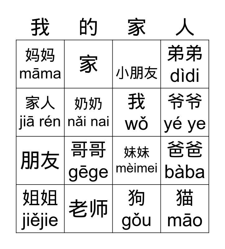 This bingo card has 16 words: 姐姐 jiějie, 老师, 小朋友, 弟弟 dìdi, 家人 jiā rén, 家, 妹妹 mèimei, 爸爸bàba, 妈妈 māma, 奶奶 nǎi nai, 狗 gǒu, 爷爷 yé ye, 朋友, 哥哥 gēge, 我 wǒ and 猫 māo.