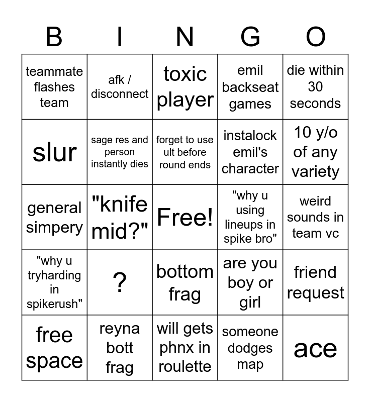 This bingo card has a free space and 27 words: are you boy or girl, someone drops skin without being asked, instalock emil's character, will gets phnx in roulette, slur, toxic player, afk / disconnect, "why u tryharding in spikerush", "why u using lineups in spike bro", friend request, general simpery, emil backseat games, free space, reyna bott frag, 10 y/o of any variety, having to report a player, sage res and person instantly dies, forget to use ult before round ends, ?, teammate flashes team, weird sounds in team vc, someone dodges map, "knife mid?", ace, bottom frag, die within 30 seconds and "you have ult".