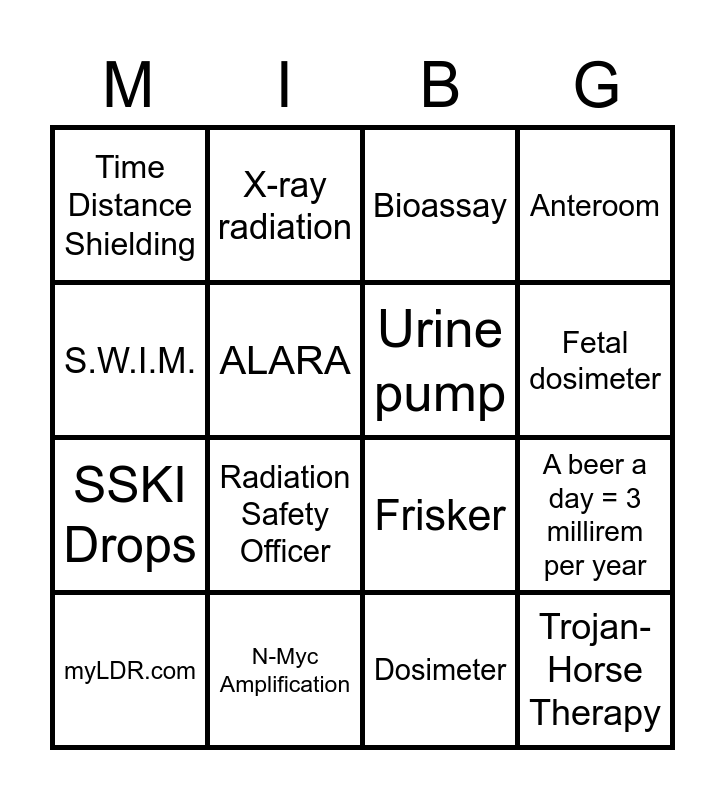 This bingo card has 16 words: N-Myc Amplification, A beer a day = 3 millirem per year, Bioassay, Time Distance Shielding, SSKI Drops, X-ray radiation, Frisker, Dosimeter, S.W.I.M., ALARA, myLDR.com, Anteroom, Radiation Safety Officer, Fetal dosimeter, Urine pump and Trojan-Horse Therapy.
