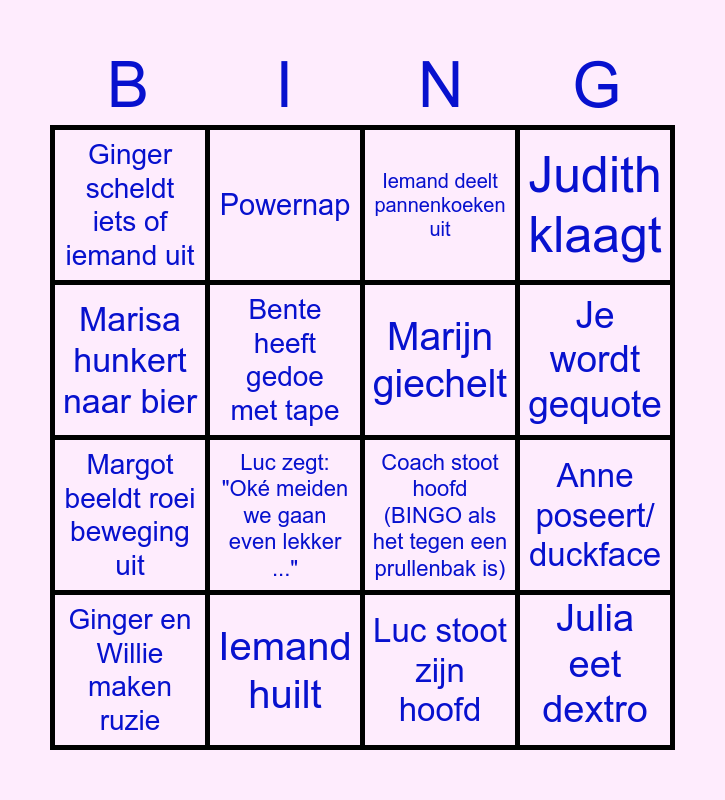This bingo card has 16 words: Iemand huilt, Anne poseert/ duckface, Iemand deelt pannenkoeken uit, Ginger scheldt iets of iemand uit, Margot beeldt roei beweging uit, Powernap, Coach stoot hoofd (BINGO als het tegen een prullenbak is), Luc stoot zijn hoofd, Marisa hunkert naar bier, Bente heeft gedoe met tape, Ginger en Willie maken ruzie, Judith klaagt, Luc zegt: "Oké meiden we gaan even lekker ...", Je wordt gequote, Marijn giechelt and Julia eet dextro.