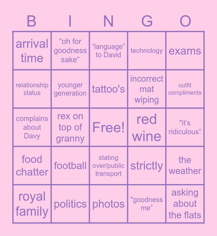 This bingo card has a free space and 24 words: football, politics, tattoo's, royal family, exams, arrival time, relationship status, “oh for goodness sake”, red wine, stating over/public transport, incorrect mat wiping, complains about Davy, strictly, the weather, younger generation, "goodness me”, "it’s ridiculous”, “language” to David, outfit compliments, rex on top of granny, asking about the flats, food chatter, technology and photos.