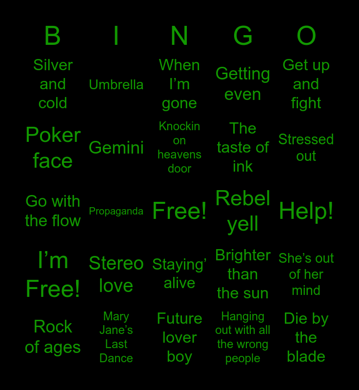 This bingo card has a free space and 50 words: Freaks, Die by the blade, Wrong, Future lover boy, Stereo love, Life eternal, Umbrella, One more night, Poker face, Burn, Gemini, Getting even, She’s out of her mind, Brighter than the sun, No love in LA, C’est la vie, Knockin on heavens door, Rebel yell, Since you been gone, Get up and fight, Propaganda, Hanging out with all the wrong people, Silver and cold, The taste of ink, High low, Don’t wait up, Stressed out, Roots, When I’m gone, Staying’ alive, Bad moon rising, The break up song, Mr. Roboto, People are strange, Mary Jane’s Last Dance, Wind of change, Still loving you, Personal Jesus, Never let me go, Help!, Refugee, Jesus he knows me, They say, Mary on a cross, Rock of ages, Go with the flow, Goo goo muck, Instanbul, I’m Free! and Wheel in the sky.