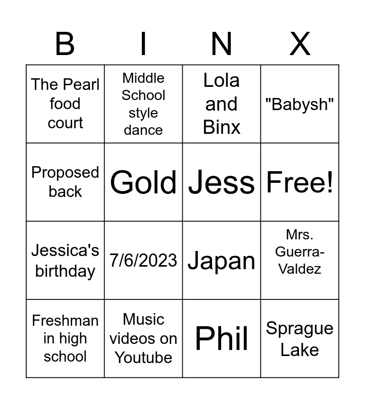 This bingo card has 18 words: 7/6/2023, Sprague Lake, Lola and Binx, The Pearl food court, Japan, "Babysh", Freshman in high school, Middle School style dance, Free!, Jessica's birthday, Phil, Proposed back, Mrs. Guerra-Valdez, Gold, Jess, Stix and Stone, Music videos on Youtube and Working on a Groovy Thing.