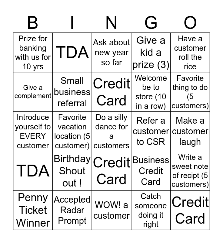 This bingo card has a free space and 24 words: Birthday Shout out !, Accepted Radar Prompt, Credit Card, Penny Ticket Winner, Have a customer roll the rice, Prize for banking with us for 10 yrs, Give a complement, TDA, Refer a customer to CSR, Credit Card, Welcome be to store (10 in a row), Introduce yourself to EVERY customer, Business Credit Card, Write a sweet note of recipt (5 customers), Small business referral, Catch someone doing it right, Make a customer laugh, Ask about new year so far, Favorite thing to do (5 customers), Favorite vacation location (5 customer), Credit Card, TDA, Give a kid a prize (3) and WOW! a customer.