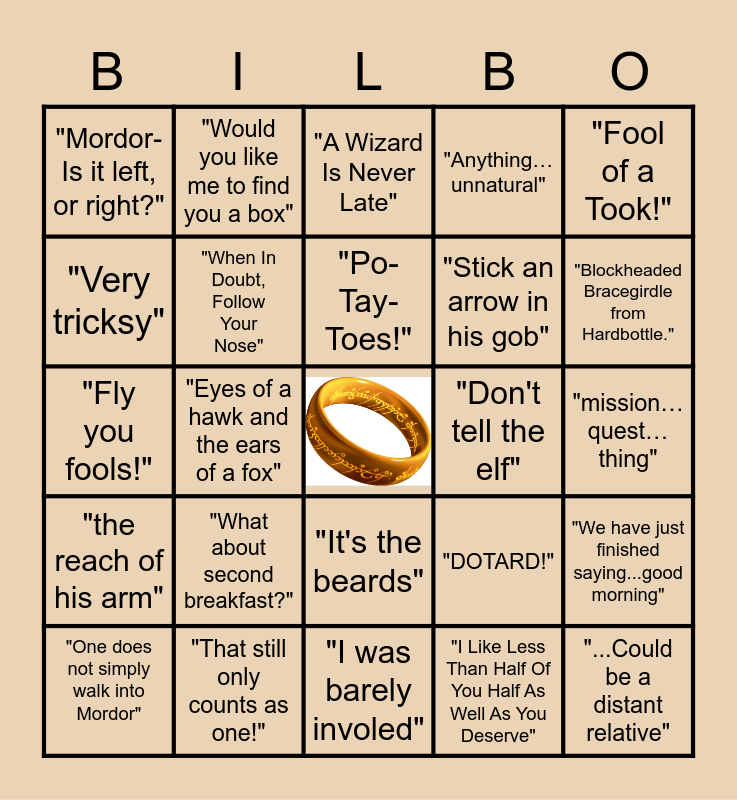 This bingo card has a free space and 24 words: "What about second breakfast?", "That still only counts as one!", "Po-Tay-Toes!", "One does not simply walk into Mordor", "Fool of a Took!", "Mordor-Is it left, or right?", "Very tricksy", "Would you like me to find you a box", "Don't tell the elf", "It's the beards", "Stick an arrow in his gob", "Fly you fools!", "DOTARD!", "We have just finished saying...good morning", "When In Doubt, Follow Your Nose", "I Like Less Than Half Of You Half As Well As You Deserve", "mission… quest… thing", "A Wizard Is Never Late", "Blockheaded Bracegirdle from Hardbottle.", "Eyes of a hawk and the ears of a fox", "...Could be a distant relative", "the reach of his arm", "Anything… unnatural" and "I was barely involed".