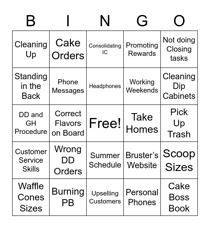 This bingo card has a free space and 24 words: Wrong DD Orders, Burning PB, Headphones, Waffle Cones Sizes, Not doing Closing tasks, Cleaning Up, Standing in the Back, Cake Orders, Take Homes, Summer Schedule, Working Weekends, DD and GH Procedure, Bruster’s Website, Scoop Sizes, Phone Messages, Personal Phones, Pick Up Trash, Consolidating IC, Cleaning Dip Cabinets, Correct Flavors on Board, Cake Boss Book, Customer Service Skills, Promoting Rewards and Upselling Customers.