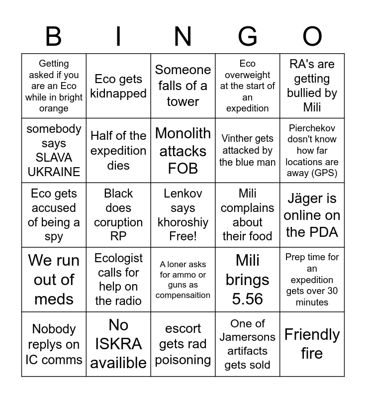 This bingo card has a free space and 24 words: Ecologist calls for help on the radio, No ISKRA availible, Monolith attacks FOB, Nobody replys on IC comms, RA's are getting bullied by Mili, Getting asked if you are an Eco while in bright orange, somebody says SLAVA UKRAINE, Eco gets kidnapped, Mili complains about their food, A loner asks for ammo or guns as compensaition, Vinther gets attacked by the blue man, Eco gets accused of being a spy, Mili brings 5.56, Prep time for an expedition gets over 30 minutes, Half of the expedition dies, One of Jamersons artifacts gets sold, Jäger is online on the PDA, Someone falls of a tower, Pierchekov dosn't know how far locations are away (GPS), Black does coruption RP, Friendly fire, We run out of meds, Eco overweight at the start of an expedition and escort gets rad poisoning.