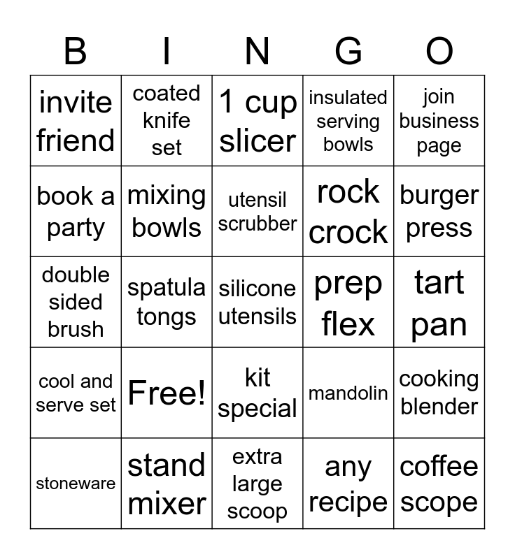This bingo card has a free space and 24 words: Free!, stand mixer, utensil scrubber, stoneware, join business page, invite friend, book a party, coated knife set, prep flex, kit special, rock crock, double sided brush, mandolin, cooking blender, mixing bowls, any recipe, tart pan, 1 cup slicer, burger press, spatula tongs, coffee scope, cool and serve set, insulated serving bowls and extra large scoop.