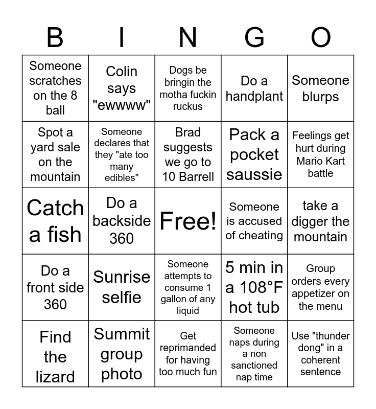 This bingo card has a free space and 24 words: Sunrise selfie, Summit group photo, Brad suggests we go to 10 Barrell, Find the lizard, Someone blurps, Someone scratches on the 8 ball, Spot a yard sale on the mountain, Colin says "ewwww", Someone is accused of cheating, Someone attempts to consume 1 gallon of any liquid, Pack a pocket saussie, Catch a fish, 5 min in a 108°F hot tub, Group orders every appetizer on the menu, Someone declares that they "ate too many edibles", Someone naps during a non sanctioned nap time, take a digger the mountain, Dogs be bringin the motha fuckin ruckus, Feelings get hurt during Mario Kart battle, Do a backside 360, Use "thunder dong" in a coherent sentence, Do a front side 360, Do a handplant and Get reprimanded for having too much fun.
