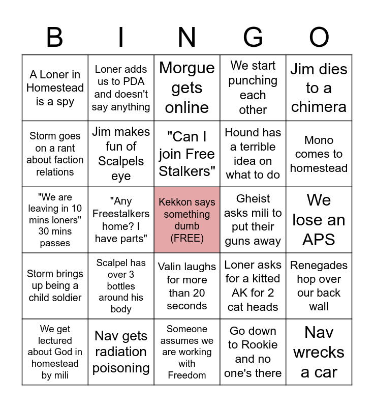 This bingo card has a free space and 24 words: Scalpel has over 3 bottles around his body, Nav gets radiation poisoning, "Can I join Free Stalkers", We get lectured about God in homestead by mili, Jim dies to a chimera, A Loner in Homestead is a spy, Storm goes on a rant about faction relations, Loner adds us to PDA and doesn't say anything, Gheist asks mili to put their guns away, Valin laughs for more than 20 seconds, Hound has a terrible idea on what to do, "We are leaving in 10 mins loners" 30 mins passes, Loner asks for a kitted AK for 2 cat heads, Renegades hop over our back wall, Jim makes fun of Scalpels eye, Go down to Rookie and no one's there, We lose an APS, Morgue gets online, Mono comes to homestead, "Any Freestalkers home? I have parts", Nav wrecks a car, Storm brings up being a child soldier, We start punching each other and Someone assumes we are working with Freedom.