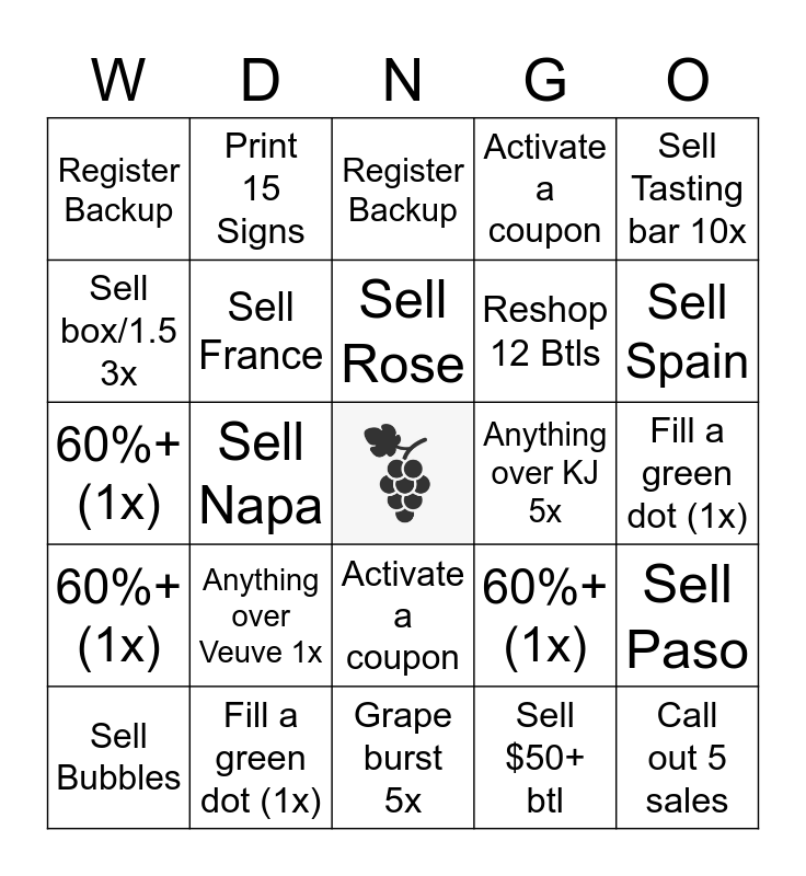 This bingo card has a free space and 34 words: 60%+ (1x), Sell $50+ btl, Register Backup, Sell Italy, 60%+ (1x), Sell France, Sell Tasting bar 10x, Sell Bubbles, Print 15 Signs, Anything over JOSH 5x, Sell Rose, Register Backup, Activate a coupon, Anything over KIM 5x, Anything over KJ 5x, Sell Spain, Fill a green dot (1x), 60%+ (1x), Anything over Veuve 1x, 60%+ (1x), Activate a coupon, Call out 5 sales, Register Backup, Fill a green dot (1x), Grape burst 5x, Call out 5 sales, Activate a coupon, Fill a green dot (1x), Reshop 12 Btls, Sell box/1.5 3x, Grape burst 5x, Sell Napa, Sell Paso and Sell RRV.