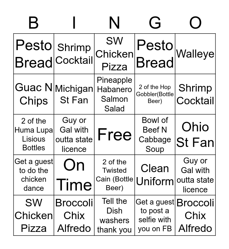 This bingo card has a free space and 24 words: On Time, Broccoli Chix Alfredo, Pineapple Habanero Salmon Salad, SW Chicken Pizza, Walleye, Pesto Bread, Guac N Chips, Shrimp Cocktail, Bowl of Beef N Cabbage Soup, 2 of the Twisted Cain (Bottle Beer), 2 of the Hop Gobbler(Bottle Beer), 2 of the Huma Lupa Lisious Bottles, Clean Uniform, Guy or Gal with outta state licence, Michigan St Fan, Get a guest to post a selfie with you on FB, Ohio St Fan, SW Chicken Pizza, Shrimp Cocktail, Guy or Gal with outta state licence, Broccoli Chix Alfredo, Get a guest to do the chicken dance, Pesto Bread and Tell the Dish washers thank you.