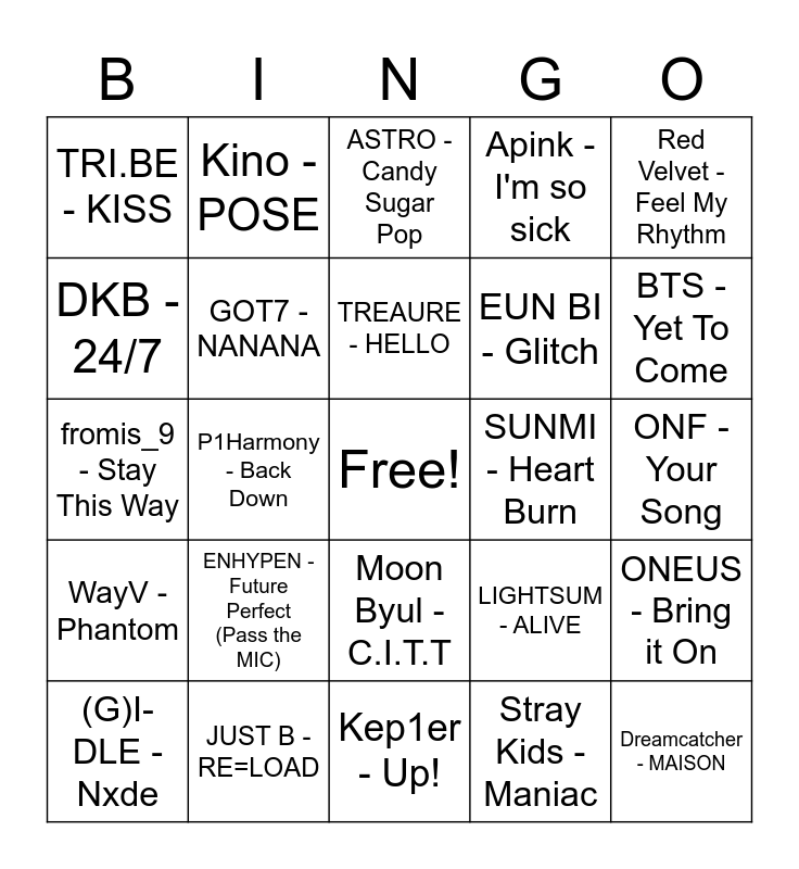 This bingo card has a free space and 25 words: ENHYPEN - Future Perfect (Pass the MIC), Kep1er - Up!, TREAURE - HELLO, (G)I-DLE - Nxde, Red Velvet - Feel My Rhythm, TRI.BE - KISS, DKB - 24/7, Kino - POSE, SUNMI - Heart Burn, Moon Byul - C.I.T.T, EUN BI - Glitch, fromis_9 - Stay This Way, LIGHTSUM - ALIVE, ONEUS - Bring it On, GOT7 - NANANA, CHUNGA HA - Sparkling, ONF - Your Song, ASTRO - Candy Sugar Pop, BTS - Yet To Come, P1Harmony - Back Down, Dreamcatcher - MAISON, JUST B - RE=LOAD, WayV - Phantom, Apink - I'm so sick and Stray Kids - Maniac.