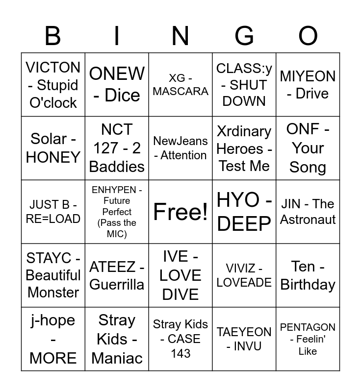 This bingo card has a free space and 25 words: ATEEZ - Guerrilla, Stray Kids - CASE 143, NewJeans - Attention, j-hope - MORE, MIYEON - Drive, VICTON - Stupid O'clock, Solar - HONEY, ONEW - Dice, HYO - DEEP, IVE - LOVE DIVE, Xrdinary Heroes - Test Me, JUST B - RE=LOAD, VIVIZ - LOVEADE, Ten - Birthday, NCT 127 - 2 Baddies, ATEEZ - HALAZIA, JIN - The Astronaut, XG - MASCARA, ONF - Your Song, ENHYPEN - Future Perfect (Pass the MIC), PENTAGON - Feelin' Like, Stray Kids - Maniac, STAYC - Beautiful Monster, CLASS:y - SHUT DOWN and TAEYEON - INVU.