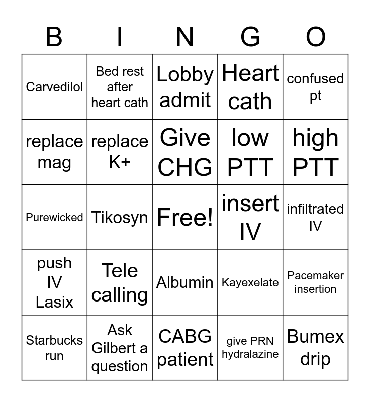 This bingo card has a free space and 29 words: Starbucks run, rounded, Tikosyn, 5 beats of vtach, Carvedilol, Lobby admit, replace K+, Tele calling, insert IV, Ask Gilbert a question, infiltrated IV, Bumex drip, CABG patient, give PRN hydralazine, high PTT, hang blood, Albumin, push IV Lasix, confused pt, Purewicked, Kayexelate, code brown, low PTT, replace mag, Heart cath, Bed rest after heart cath, Pacemaker insertion, Give CHG and Push Dilaudid.
