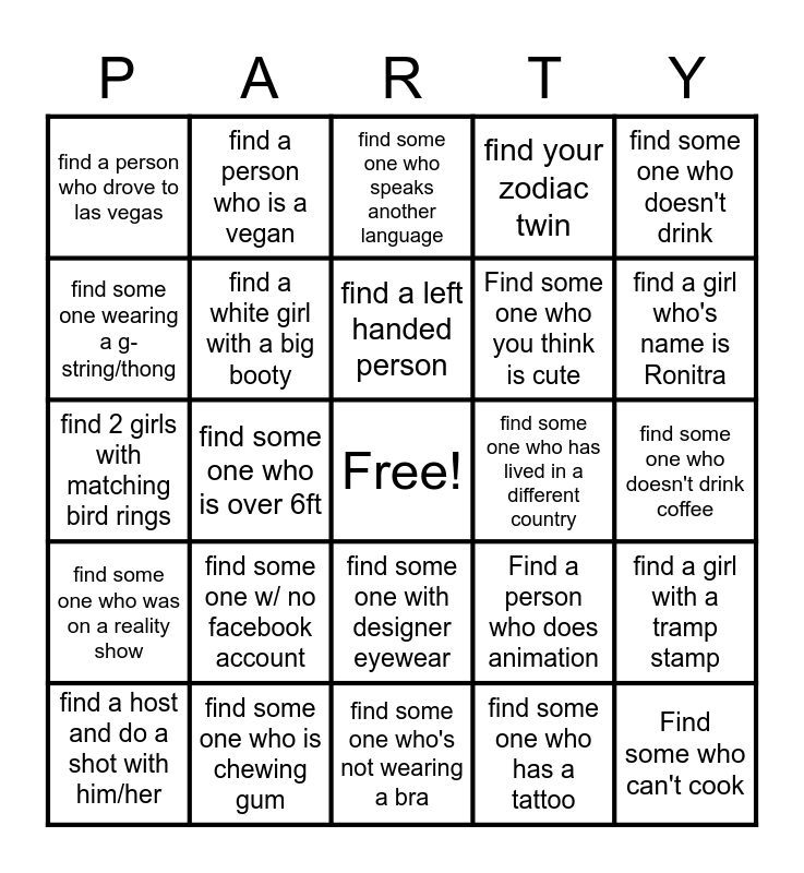 This bingo card has a free space and 24 words: find a host and do a shot with him/her, find some one w/ no facebook account, find a left handed person, find some one who has a tattoo, find some one who doesn't drink, find a person who drove to las vegas, find a person who is a vegan, find some one who speaks another language, find some one who has lived in a different country, find some one who doesn't drink coffee, find 2 girls with matching bird rings, find a white girl with a big booty, Find a person who does animation, find a girl with a tramp stamp, find some one wearing a g-string/thong, find some one who is chewing gum, find some one who's not wearing a bra, find your zodiac twin, find a girl who's name is Ronitra, find some one who was on a reality show, find some one who is over 6ft, find some one with designer eyewear, Find some one who you think is cute and Find some who can't cook.