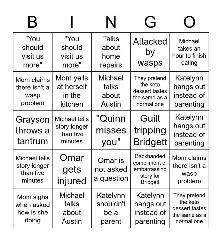 This bingo card has a free space and 55 words: No seasoning in the food, Omar is not asked a question, Grandma says something off color, Attacked by wasps, Mom claims there isn't a wasp problem, Omar gets injured, Mom yells at herself in the kitchen, Backhanded compliment or embarrassing story for Bridgett, They pretend the keto dessert tastes the same as a normal one, Silence longer than a minute, "You should visit us more", They describe a movie plot as conversation, Mom yells at dogs, Mom sighs when asked how is she doing, Doesn't make a plan or reservation, "You should come see the horses", Talks about home repairs, Guilt tripping Bridgett, Grayson throws a tantrum, Michael tells story longer than five minutes, Michael talks about Austin, Katelynn shouldn't be a parent, Katelynn hangs out instead of parenting, Michael takes an hour to finish eating, Grayson throws a tantrum, Michael tells story longer than five minutes, Michael talks about Austin, Katelynn shouldn't be a parent, Katelynn hangs out instead of parenting, Michael takes an hour to finish eating, No seasoning in the food, Omar is not asked a question, Grandma says something off color, Attacked by wasps, Mom claims there isn't a wasp problem, Omar gets injured, Mom yells at herself in the kitchen, Backhanded compliment or embarrassing story for Bridgett, They pretend the keto dessert tastes the same as a normal one, Silence longer than a minute, "You should visit us more", Guilt tripping Bridgett, They describe a movie plot as conversation, Mom yells at dogs, Mom sighs when asked how is she doing, Doesn't make a plan or reservation, "You should come see the horses", Talks about home repairs, "Quinn misses you", Grayson throws a tantrum, Michael tells story longer than five minutes, Michael talks about Austin, Katelynn shouldn't be a parent, Katelynn hangs out instead of parenting and Michael takes an hour to finish eating.