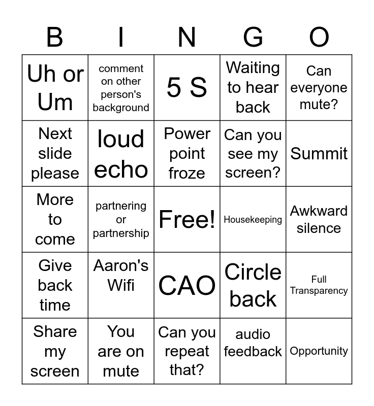 This bingo card has a free space and 24 words: Aaron's Wifi, You are on mute, Power point froze, Share my screen, Can everyone mute?, Uh or Um, Next slide please, comment on other person's background, Housekeeping, CAO, Can you see my screen?, More to come, Circle back, Full Transparency, loud echo, audio feedback, Awkward silence, 5 S, Summit, partnering or partnership, Opportunity, Give back time, Waiting to hear back and Can you repeat that?.