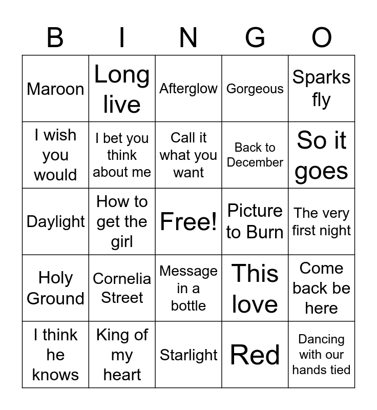 This bingo card has a free space and 25 words: Cornelia Street, Starlight, Call it what you want, I think he knows, Sparks fly, Maroon, I wish you would, Long live, Picture to Burn, Message in a bottle, Back to December, Daylight, This love, Come back be here, I bet you think about me, Treacherous, The very first night, Afterglow, So it goes, How to get the girl, Dancing with our hands tied, King of my heart, Holy Ground, Gorgeous and Red.
