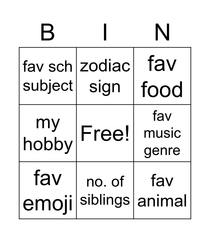 This bingo card has a free space and 8 words: fav music genre, fav food, zodiac sign, fav emoji, fav sch subject, fav animal, my hobby and no. of siblings.