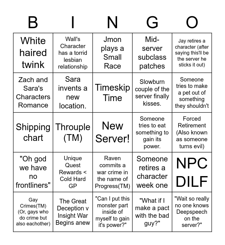 This bingo card has a free space and 24 words: Unique Quest Rewards < Cold Hard GP, The Great Deception v Insight War Begins anew, Timeskip Time, Gay Crimes(TM) (Or, gays who do crime but also eachother), Jay retires a character (after saying this'll be the server he sticks it out), White haired twink, Zach and Sara's Characters Romance, Wall's Character has a torrid lesbian relationship, Someone tries to eat something to gain its power., Raven commits a war crime in the name of Progress(TM), Slowburn couple of the server finally kisses., Shipping chart, Someone retires a character week one, NPC DILF, Sara invents a new location., "What if I make a pact with the bad guy?", Forced Retirement (Also known as someone turns evil), Jmon plays a Small Race, Someone tries to make a pet out of something they shouldn't, Throuple (TM), "Wait so really no one knows Deepspeech on the server?", "Oh god we have no frontliners", Mid-server subclass patches and "Can I put this monster part inside of myself to gain it's power?".