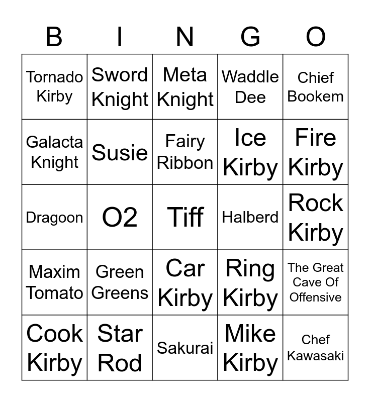 This bingo card has 75 words: Kirby, King Dedede, Meta Knight, Marx, Magolor, Rick, Kine, Coo, Gooey, Whispy Woods, Chef Kawasaki, Adeleine, Fairy Ribbon, Galacta Knight, Morpho Knight, O2, Knuckle Joe, Tiff, Warp Star, Chief Bookem, Escargoon, Dragoon, Susie, Sword Knight, Waddle Dee, Waddle Doo, Dyna Blade, Poppy Jr., Prince Fluff, The Lor Starcutter, Fairy Queen, Mr. Star, Gordo, Ring Kirby, Fire Kirby, Ice Kirby, Ball Kirby, Yo-Yo Kirby, Rock Kirby, Mike Kirby, Sword Kirby, Hammer Kirby, Artist Kirby, Water Kirby, Balloon Kirby, Dr. Kirby, Cook Kirby, Tornado Kirby, Fighter Kirby, Parasol Kirby, Smash Bros Kirby, Car Kirby, Plasma Kirby, Robobot Armor, Ninja Kirby, Leaf Kirby, Spike Kirby, Sleep Kirby, Whip Kirby, Planet Pop Star, Green Greens, Ripple Star, Hypernova, Elline, Sectonia, Halberd, The Three Sisters, Hyness, Server Hands, The Great Cave Of Offensive, Maxim Tomato, Star Rod, Kirbo, Sakurai and Taranza.