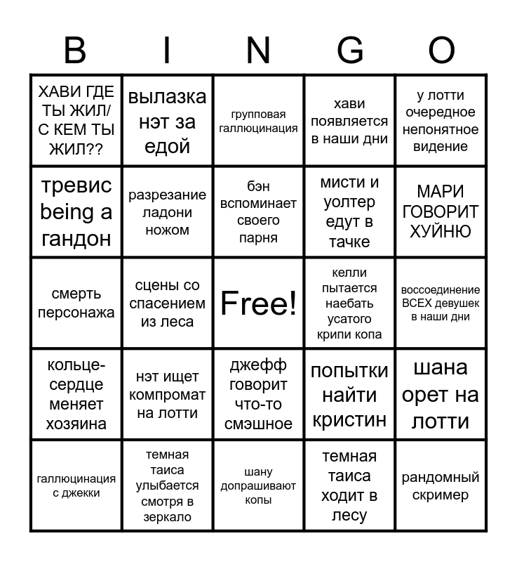 This bingo card has a free space and 24 words: нэт ищет компромат на лотти, темная таиса улыбается смотря в зеркало, бэн вспоминает своего парня, галлюцинация с джекки, у лотти очередное непонятное видение, ХАВИ ГДЕ ТЫ ЖИЛ/С КЕМ ТЫ ЖИЛ??, тревис being a гандон, вылазка нэт за едой, келли пытается наебать усатого крипи копа, джефф говорит что-то смэшное, мисти и уолтер едут в тачке, смерть персонажа, попытки найти кристин, шана орет на лотти, разрезание ладони ножом, темная таиса ходит в лесу, воссоединение ВСЕХ девушек в наши дни, групповая галлюцинация, МАРИ ГОВОРИТ ХУЙНЮ, сцены со спасением из леса, рандомный скример, кольце-сердце меняет хозяина, хави появляется в наши дни and шану допрашивают копы.