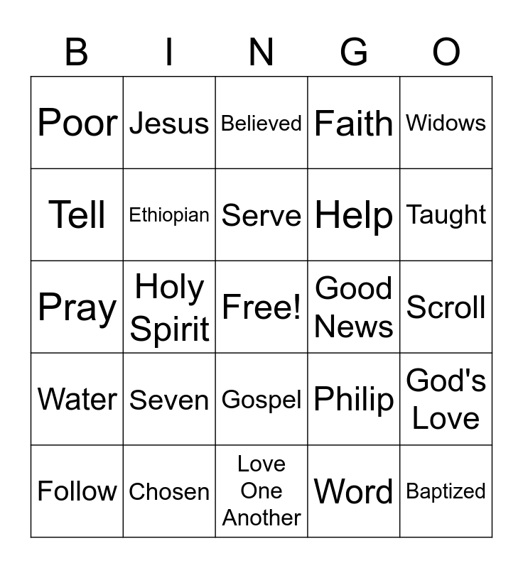 This bingo card has a free space and 24 words: Seven, Chosen, Serve, Follow, Widows, Poor, Tell, Jesus, Good News, Gospel, Help, Pray, Philip, God's Love, Ethiopian, Word, Scroll, Believed, Taught, Holy Spirit, Baptized, Water, Faith and Love One Another.