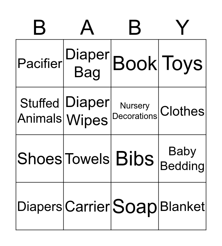 This bingo card has a free space and 15 words: Diapers, Blanket, Book, Pacifier, Clothes, Stuffed Animals, Towels, Soap, Diaper Wipes, Shoes, Baby Bedding, Toys, Nursery Decorations, Diaper Bag and Carrier.