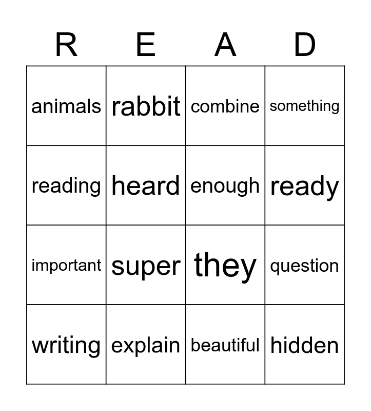 This bingo card has 40 words: your, they, live, enough, know, solve, ready, probably, reading, hidden, question, something, writing, beautiful, explain, altogether, summer, animals, climb, combine, hopeful, friend, important, heard, saw, people, climate, community, more, spend, time, trouble, dinner, supper, super, diner, desert, dessert, rabbit and cooking.