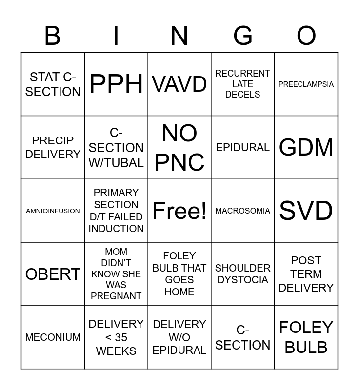 This bingo card has a free space and 27 words: SHOULDER DYSTOCIA, JADA, EPIDURAL, DELIVERY W/O EPIDURAL, PRECIP DELIVERY, VAVD, PPH, OBERT, MACROSOMIA, POST TERM DELIVERY, AMNIOINFUSION, RECURRENT LATE DECELS, MECONIUM, DELIVERY < 35 WEEKS, GDM, OLIGOHYDRAMNIOS, C-SECTION W/TUBAL, NO PNC, MOM DIDN’T KNOW SHE WAS PREGNANT, STAT C-SECTION, SVD, C-SECTION, PRIMARY SECTION D/T FAILED INDUCTION, FOLEY BULB, FOLEY BULB THAT GOES HOME, PREECLAMPSIA and NURSE DELIVERY.
