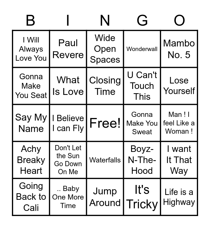 This bingo card has a free space and 41 words: Macarena, Say My Name, Black or White, What Is Love, .. Baby One More Time, Waterfalls, Closing Time, U Can't Touch This, Mambo No. 5, Achy Breaky Heart, I Believe I can Fly, Wonderwall, Life is a Highway, Man ! I feel Like a Woman !, Gonna Make You Sweat, Don't Let the Sun Go Down On Me, Un-Break My Heart, I Will Always Love You, Two Princes, Wide Open Spaces, I want It That Way, Tearin' Up My Heart, Jump Around, U Can't Touch This, Push It, All I Do is Win, It's Tricky, Just a Friend, Lose Yourself, Gangster's Paradise, Fight For Your Right, Paul Revere, Going Back to Cali, Whatta Man, Boyz-N-The-Hood, Gonna Make You Seat, This Is How We Do IT, Hey Mr. DJ, Wild Wild West, Jam On It and I Feel For You.