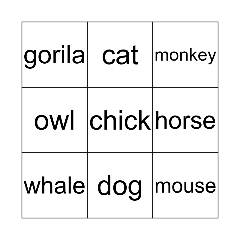 This bingo card has a free space and 8 words: horse, monkey, cat, whale, gorila, mouse, owl and dog.