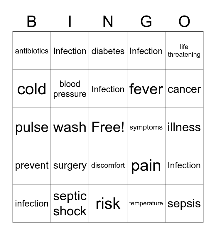 This bingo card has a free space and 29 words: infection, short of breath, wash, wounds, antibiotics, diabetes, blood pressure, surgery, symptoms, septic shock, illness, sepsis, risk, temperature, cancer, confusion, discomfort, prevent, life threatening, pulse, pain, 911, fever, cold, Infection, Infection, Infection, Infection and Infection.