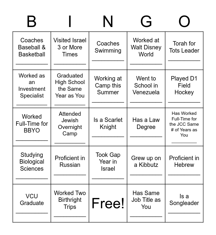 This bingo card has 31 words: Free!, Attended Jewish Day Camp __________, Attended Jewish Overnight Camp __________, Became Bar Mitzvah in Israel __________, Coaches Baseball & Basketball __________, Coaches Swimming __________, Graduated High School the Same Year as You __________, Grew up on a Kibbutz __________, Has a Law Degree __________, Has Same Job Title as You __________, Has Worked Full-Time for the JCC Same # of Years as You __________, Is a Scarlet Knight __________, Is a Songleader __________, Masters in Youth Ministry __________, Played D1 Field Hockey __________, Produced & Hosted "Milk & Honey" Radio Show __________, Proficient in Hebrew __________, Proficient in Russian __________, Studying Biological Sciences __________, Took Gap Year in Israel __________, Torah for Tots Leader __________, Traveled to Israel for Grandparents' 50th Anniversary __________, VCU Graduate __________, Visited Israel 3 or More Times __________, Went to School in Venezuela __________, Worked as an Investment Specialist __________, Worked at Walt Disney World __________, Worked Full-Time for BBYO __________, Worked Two Birthright Trips __________, Working at Camp this Summer __________ and Working on MPA __________.