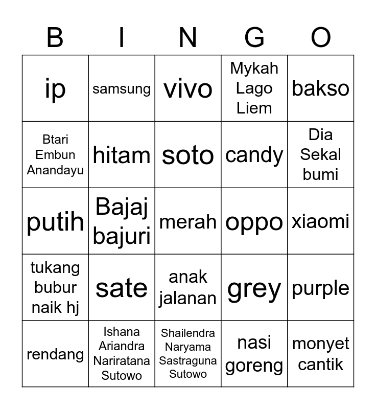 This bingo card has a free space and 24 words: rendang, sate, soto, nasi goreng, bakso, ip, samsung, vivo, oppo, xiaomi, putih, hitam, grey, purple, Btari Embun Anandayu, Ishana Ariandra Nariratana Sutowo, Shailendra Naryama Sastraguna Sutowo, Mykah Lago Liem, Dia Sekal bumi, tukang bubur naik hj, Bajaj bajuri, anak jalanan, candy and monyet cantik.